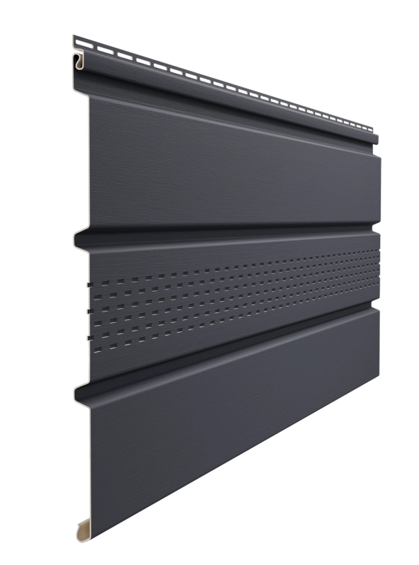 Для отделки свесов неотапливаемых помещений, где не требуется интенсивная вентиляция, применяются частично перфорированные софиты. В данном случае, перфорация нанесена не по всей поверхности, а только на центральную часть. Такой подход обеспечивает достаточный приток воздуха под кровлю (на 40-60% меньше, чем у полностью перфорированных) и снижает теплопотери