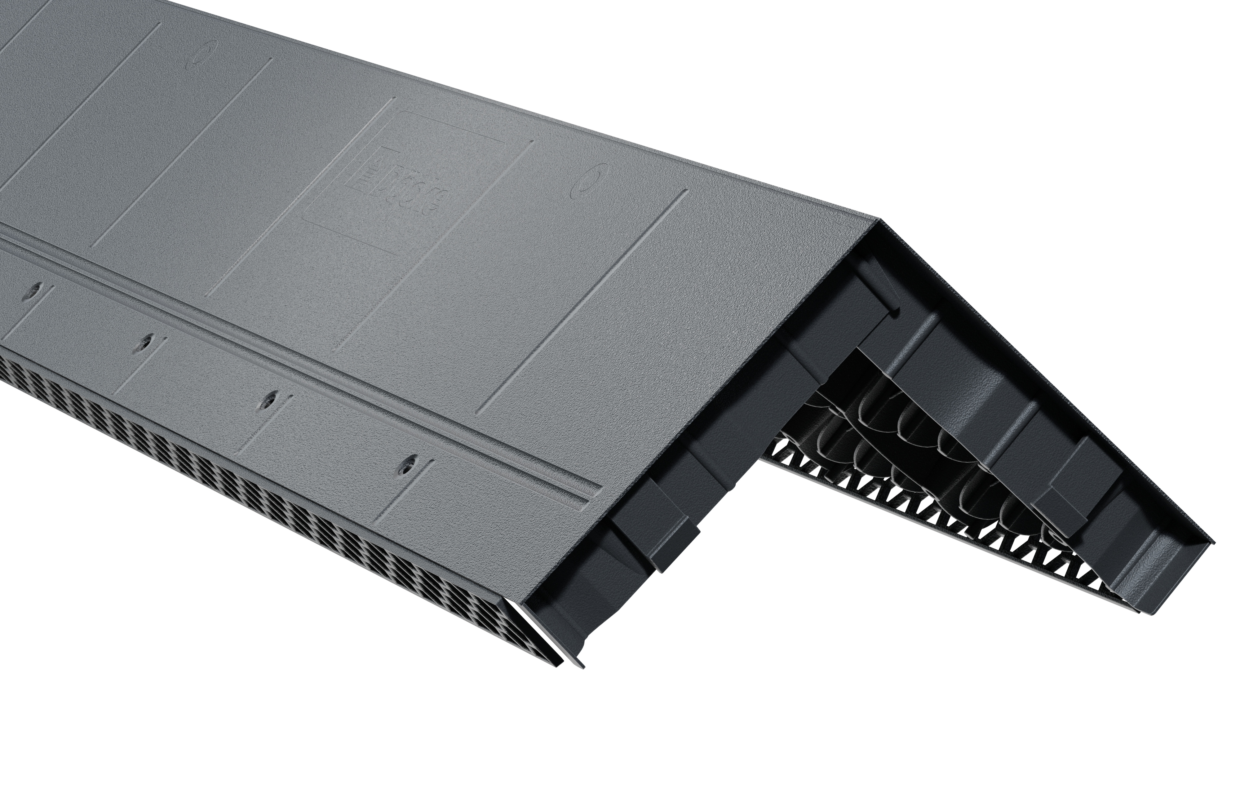 Коньковый аэратор предназначен для вентиляции подкровельного пространства скатной крыши. Монтируется по всей длине горизонтально расположенных коньков скатных крыш. Служит главным элементом вентиляции. Приток воздуха организуют через карнизный свес, а также канал, по которому воздух будет поступать к аэратору.